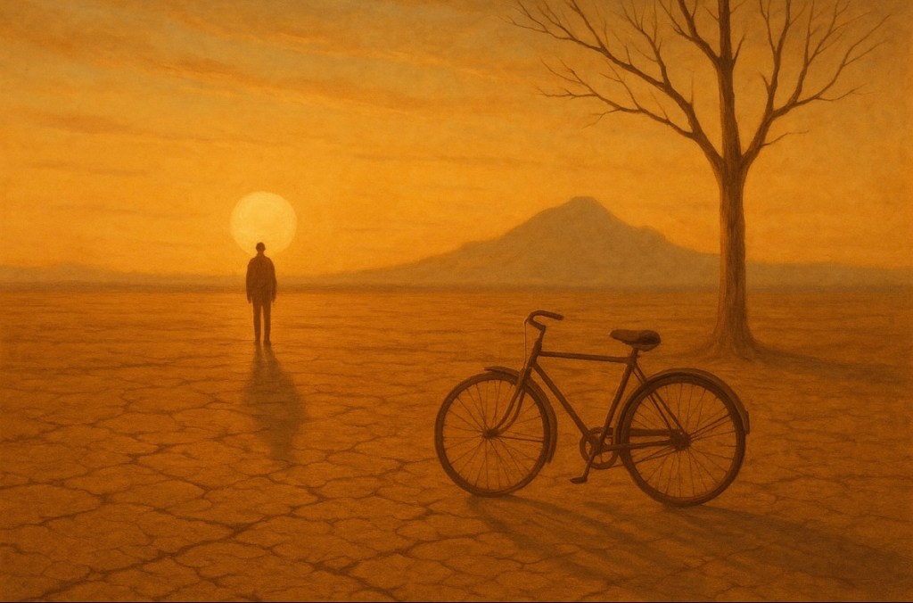 A man and a bicycle, between the earth and the sunset, in the silence of the landscape that remains.