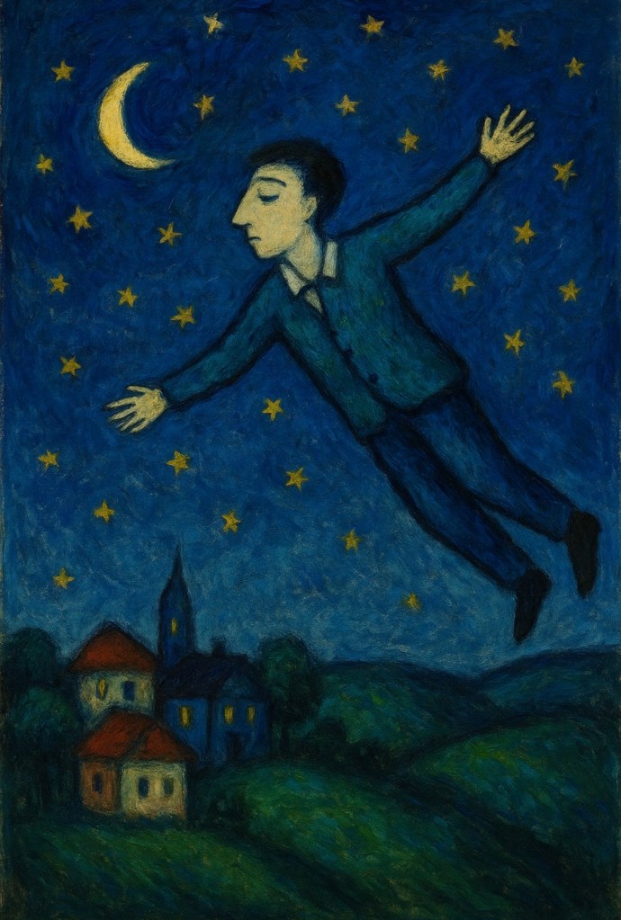 L’uomo che vola sopra la città, tra sogno e ferita, cerca nel cielo la forma possibile della vita.